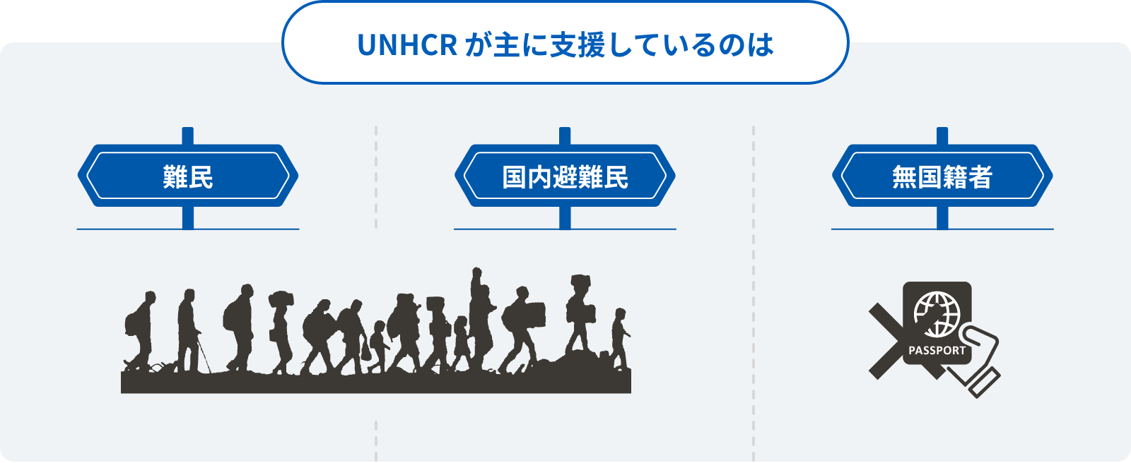 国を出て安全な場所を求める難民に加えて、自国の中で避難生活を送る「国内避難民」もいます。また、どの国からも国民と認められず、基本的な権利が保障されないまま暮らしている「無国籍者」もいます。